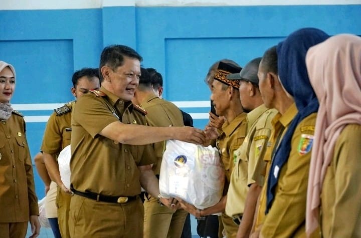 Wakil Gubernur Lampung, Jihan Nurlela membagikan paket sembako kepada Aparatur Sipil Negara (ASN) Golongan I dan Golongan II di Lingkungan Pemerintah Provinsi Lampung, yang digelar dalam Kegiatan Korpri Ramadan Berbagi, di Gedung Green Sport Arena, Kantor Gubernur Lampung, Selasa (25/03/2025).