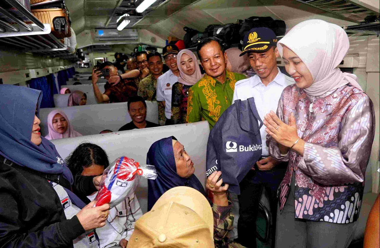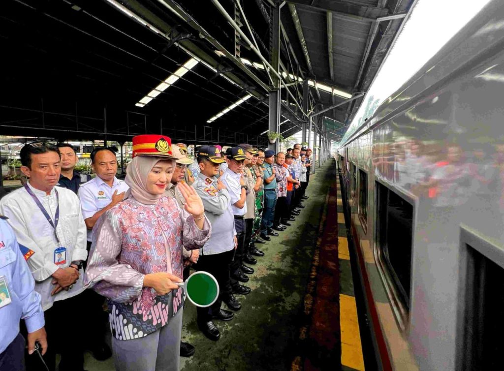 Wakil Gubernur Lampung, Jihan Nurlela secara resmi melepas keberangkatan Kereta Api Rajabasa rute Tanjung Karang-Kertapati, dalam Program Mudik Gratis Kereta Api yang digelar oleh Pemerintah Provinsi Lampung, di Stasiun Kereta Api Tanjung Karang, Kamis (27/03/2025).