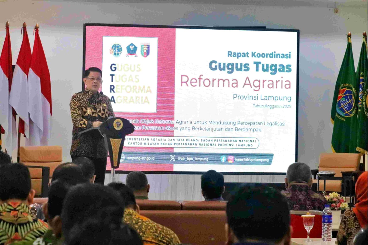 Gubernur Lampung diwakili Pj. Sekretaris Daerah Provinsi Lampung M. Firsada membuka Rapat Koordinasi Gugus Tugas Reforma Agraria (GTRA) Provinsi Lampung Tahun 2025, bertempat di Kantor Wilayah Badan Pertanahan Nasional Provinsi Lampung, Selasa (3/6/2025).
