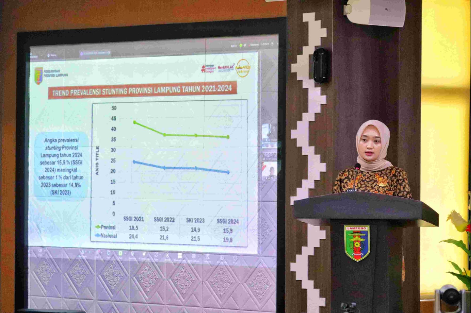 Prevalensi stunting di Provinsi Lampung terus menurun dari 26,26% di tahun 2019, hingga menjadi 14,9% di tahun 2023, dan menjadi provinsi terendah keempat prevalensi stuntingnya di Indonesia. Namun, di tahun 2024 terjadi peningkatan prevalensi stunting di Provinsi Lampung menjadi sebesar 15,9%, atau meningkat 1% dari tahun 2023.