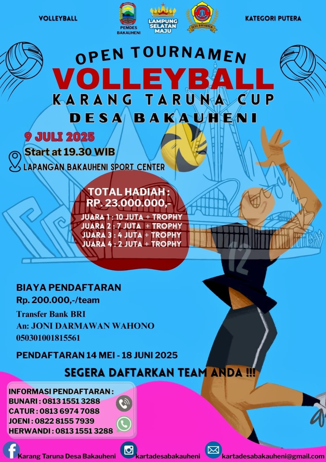 Semangat olahraga dan kebersamaan pemuda kembali menggema di Desa Bakauheni melalui gelaran Open Turnamen Volly Ball Karang Taruna Cup 1. Kegiatan ini resmi dibuka pada Rabu, 9 Juli 2025, di Lapangan Desa Bakauheni dan menjadi momentum penting dalam mendorong kreativitas, sportivitas, dan kekompakan generasi muda.