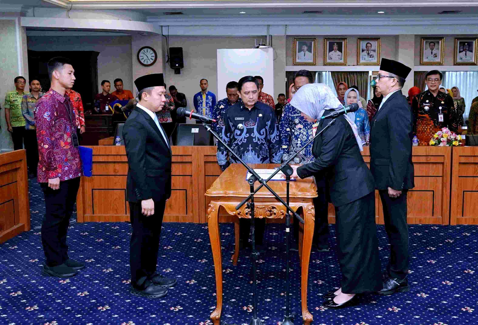 Atas nama Gubernur Lampung, Sekdaprov Marindo Kurniawan melantik dan mengambil Sumpah/Janji Jabatan 2 Pejabat Pimpinan Tinggi Pratama di lingkungan Pemerintah Provinsi Lampung, di Ruang Rapat Utama, Kamis (24/7/2025).