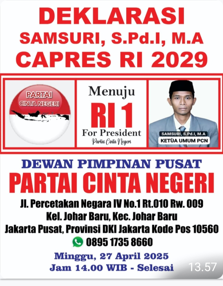 DEKLARASI SAMSURI, S.Pd.I, M.A ( KETUA UMUM PARTAI CINTA NEGERI ) SEBAGAI CALON PRESIDEN REPUBLIK INDONESIA PERIODE 2029 – 2034.