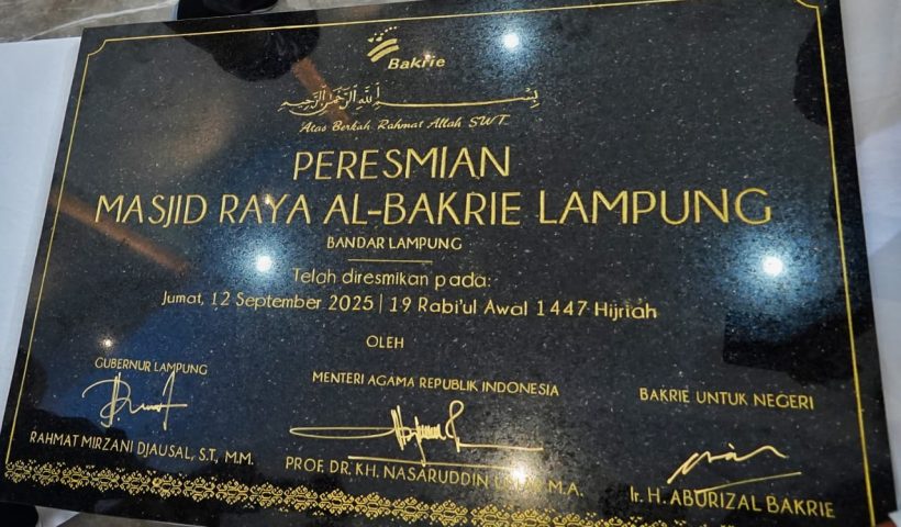 BANDAR LAMPUNG—Gubernur Lampung, Rahmat Mirzani Djausal bersama Menteri Agama RI Nasaruddin Umar dan tokoh nasional Aburizal Bakrie menandatangani prasasti sebagai tanda peresmian Masjid Raya Al-Bakrie…