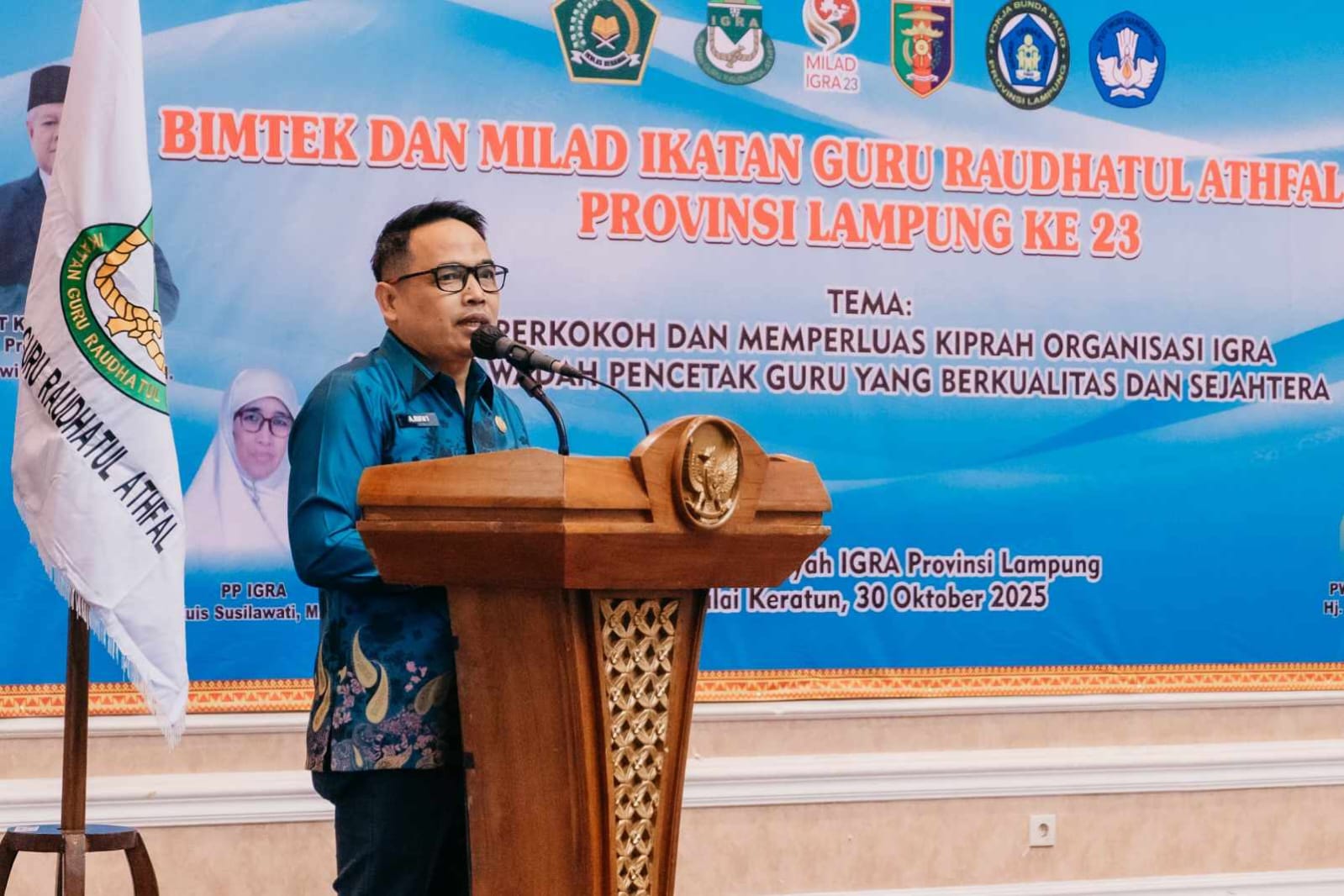 Bunda PAUD (Pendidikan Anak Usia Dini) Provinsi Lampung, Purnama Wulan Sari Mirza membuka Bimtek Penyusunan Perangkat Pembelajaran Kurikulum Berbasis Capaian (KBC) RA dalam rangka memperingati Milad Ikatan Guru Raudhatul Athfal (IGRA) ke-23 bertempat di Balai Keratun Lt III, Komplek Kantor Gubernur, Kamis (30/10/2025).