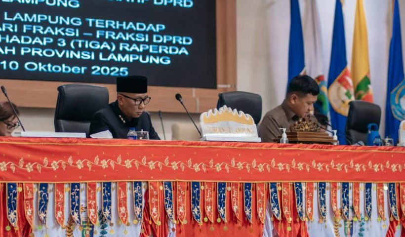 BANDAR LAMPUNG Gubernur Lampung, Rahmat Mirzani Djausal menyampaikan tanggapan terhadap pemandangan umum fraksi-fraksi DPRD Lampung atas tiga Rancangan Peraturan Daerah (Raperda) prakarsa Pemerintah Provinsi Lampung…