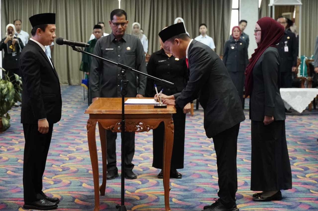 Gubernur Lampung diwakili oleh Sekretaris Daerah Provinsi Lampung, Marindo Kurniawan melantik sekaligus mengambil sumpah jabatan Pejabat Administrator dan Pejabat Pengawas di Lingkungan Pemerintah Provinsi Lampung yang digelar di Balai Keratun Lantai III, Kompleks Kantor Gubernur Lampung, Rabu (21/01/2026).