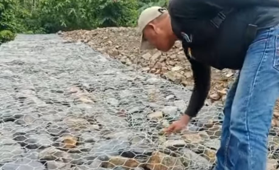 Kontruksi batu beronjong yang mestinya memakai batu belah dan berasal dari perusahaan yang mempunyai legalitas (Izin resmi), diganti dengan batu kali bulat yang diduga diambil dari aliran sungai setempat.