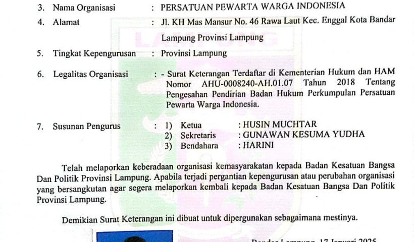 Bandar Lampung,Koran – KPK.com – Persatuan Pewarta Warga Indonesia (PPWI) Provinsi Lampung resmi tercatat sebagai organisasi kemasyarakatan di Badan Kesatuan Bangsa dan Politik (Bakesbangpol) Provinsi…