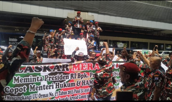 Jakarta Ribuan anggota Laskar Merah Putih (LMP) memadati depan kantor Kementerian Hukum dan HAM (Kemenkumham) di Jakarta dalam aksi besar-besaran. Mereka menuntut keadilan atas kepengurusan…