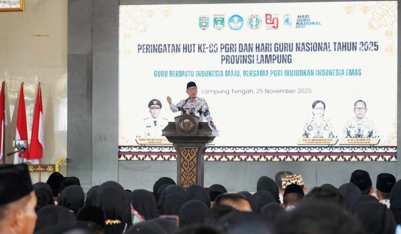 LAMTENG Gubernur Lampung, Rahmat Mirzani Djausal memimpin upacara peringatan Hari Ulang Tahun (HUT) ke-80 Persatuan Guru Republik Indonesia (PGRI) dan Hari Guru Nasional 2025 tingkat…