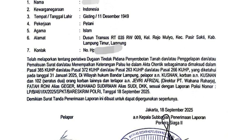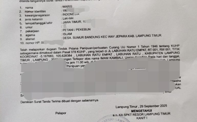 Lampung Timur Kasus dugaan penipuan bermodus jual-beli tanah kembali mencuat di Kabupaten Lampung Timur. Seorang warga Desa Sumur Bandung, Kecamatan Way Jepara, bernama Waris (71)…